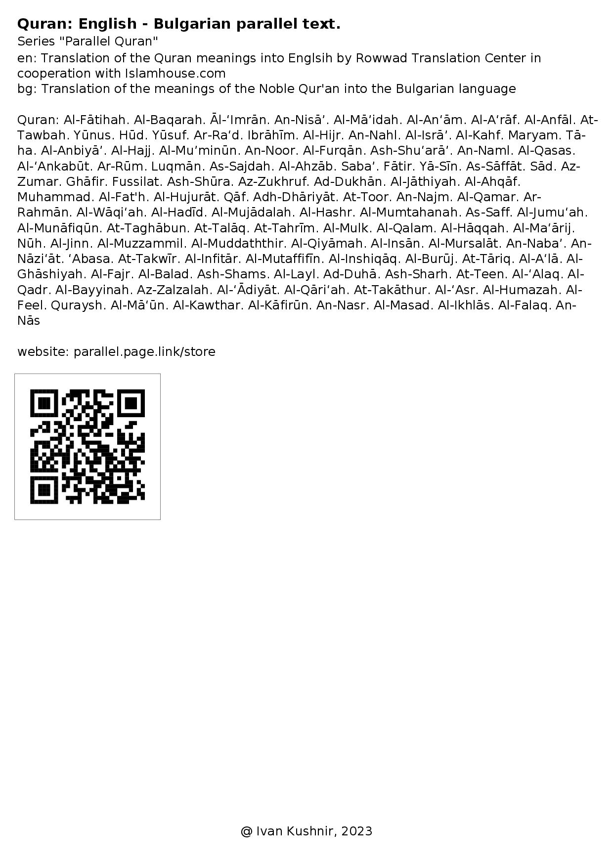 [PDF] Quran: English - Bulgarian parallel text$1.99$1.99https://schema.org/InStockusdprint & readprint & readКоран: английски - български паралелен текстAdd to cartPagesSize2 MBLength357 pagesAdd to wishlist New wishlistShareShare on XShare on Facebook Copy linkCopy product URL